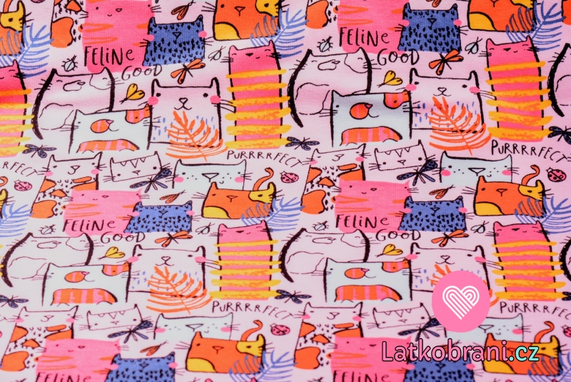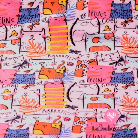 Teplákovina potisk kočky s peříčky a motýlky na baby růžové