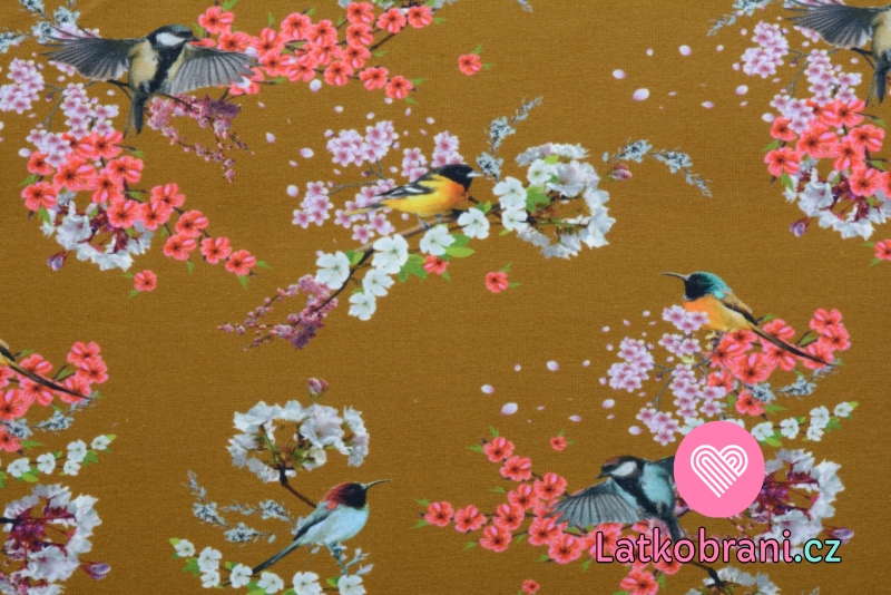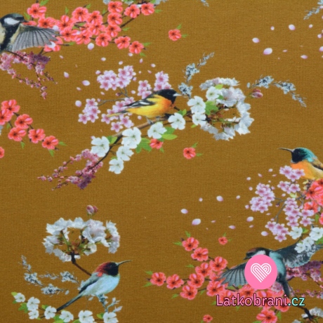 Teplákovina počesaná ptáčci mezi barevnými květy na tmavší okrové