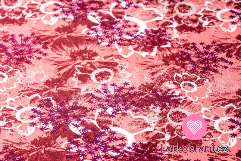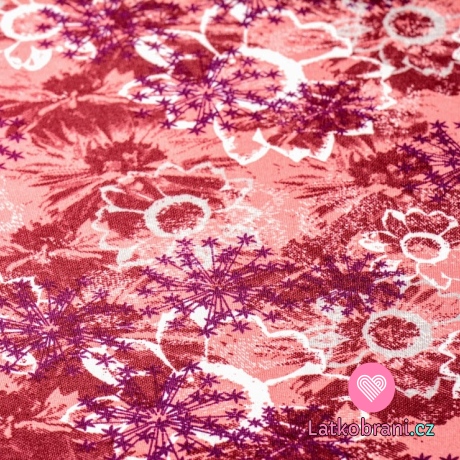 Teplákovina potisk bordó květy s fialovými pampeliškovým chmýřím na starorůžové