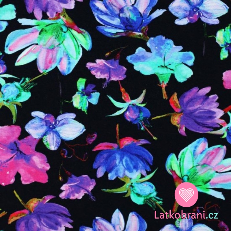 Úplet potisk viskózový pestré květy na černé