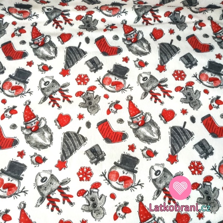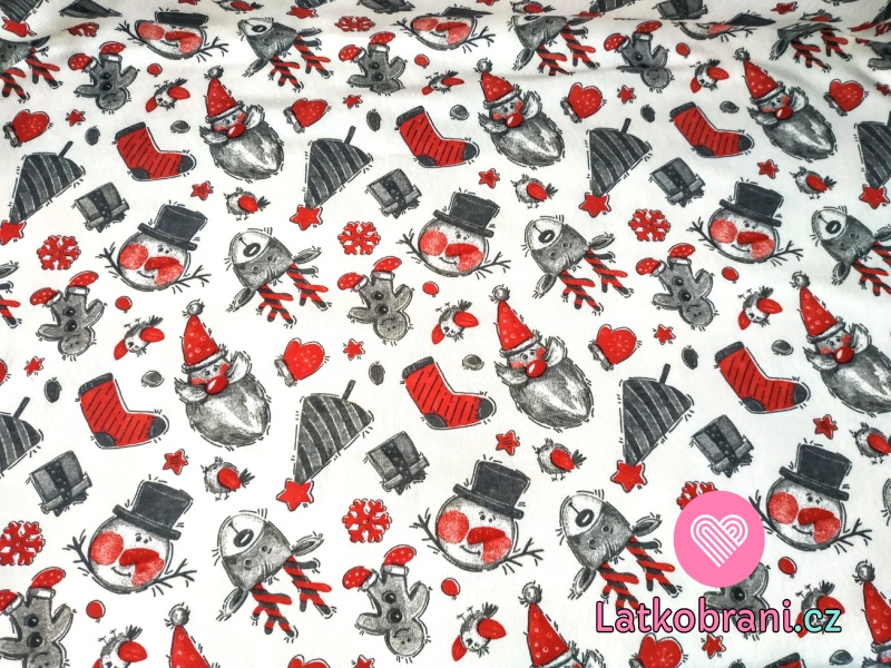 Teplákovina, mikinovina počesaná zimní, vánoční sobi, sněhuláci, perníčky, stromečky na smetanové