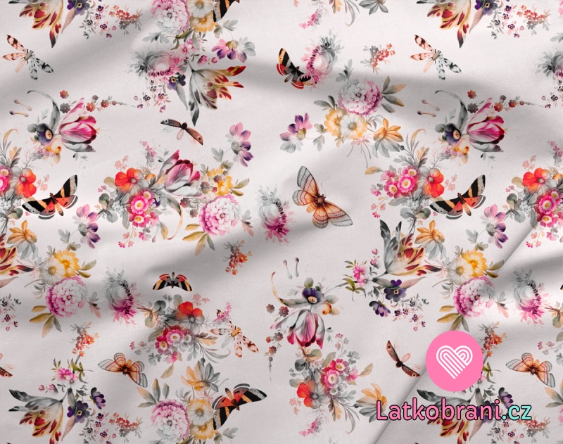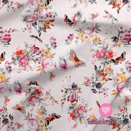 Teplákovina potisk orientální květy mezi motýly na smetanovorůžové