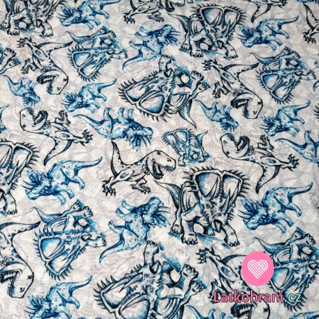 Teplákovina potisk tyrkysové a černé obrysy dinosaurů na světle šedé