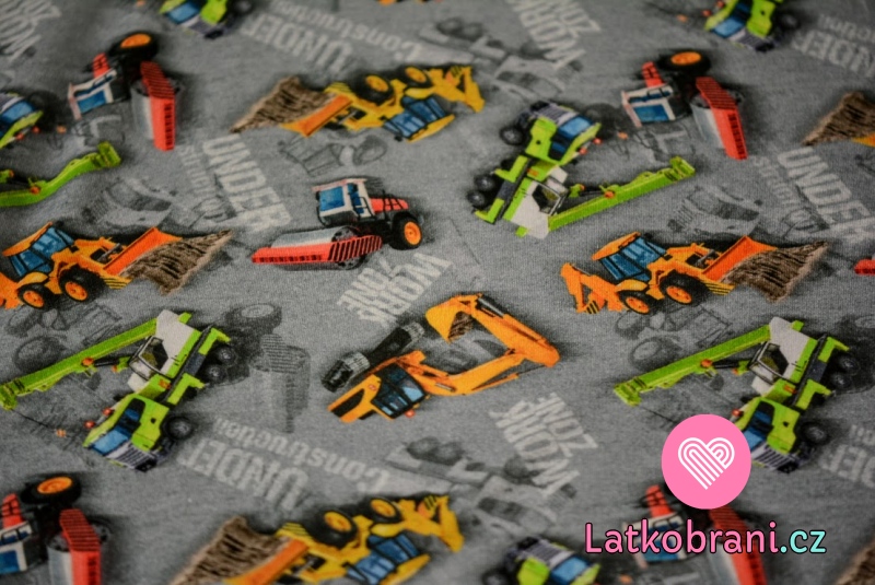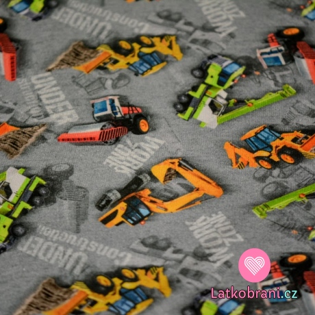 Úplet potisk pracovní stroje bagry a nákladní auta na šedé