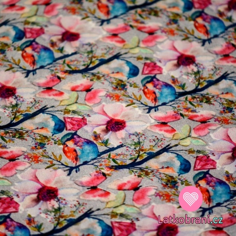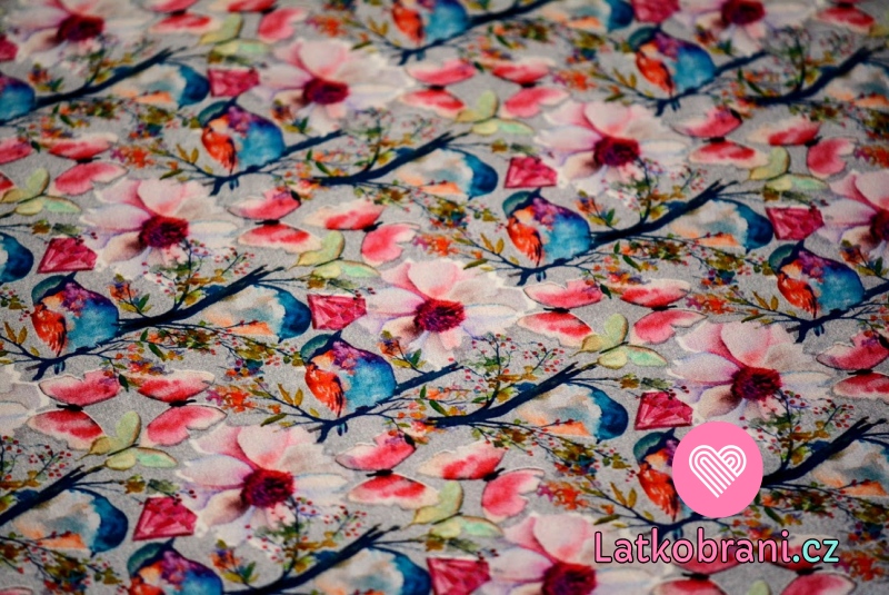 Úplet potisk pestré květy, motýli a ptáčci na šedé