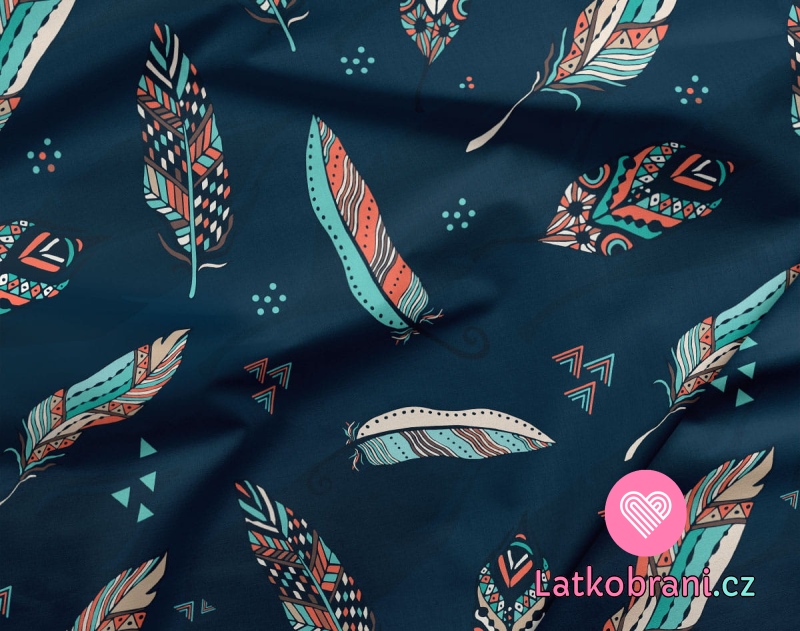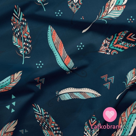 Teplákovina potisk oranžovotyrkysová peříčka na tmavě modré