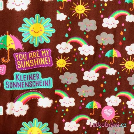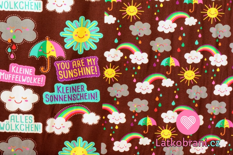 Úplet potisk pestré dešťové kapky, mráčky, nápisy a duha na teplé hnědé