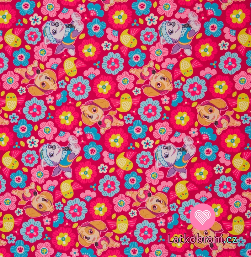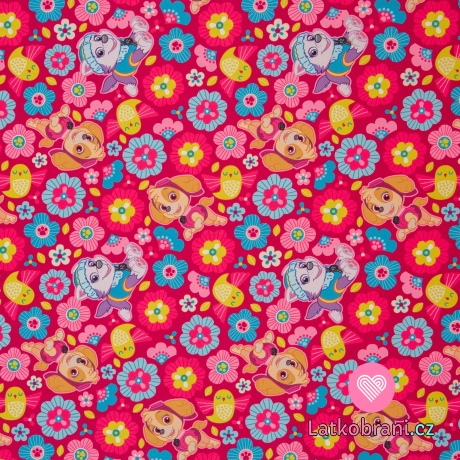 Softshell potisk Tlapková patrola mezi růžovými a modrými květinami