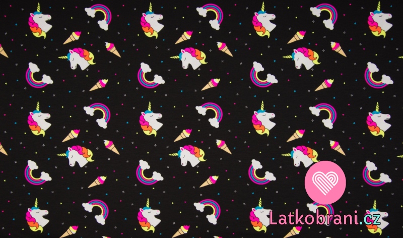 Úplet potisk neonoví jednorožci, zmrzliny a duhy na černé