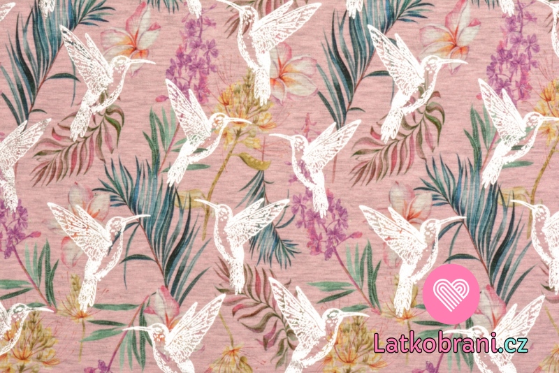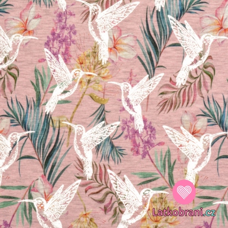 Úplet potisk květy a metalický stříbrný kolibřík na starorůžovém melé