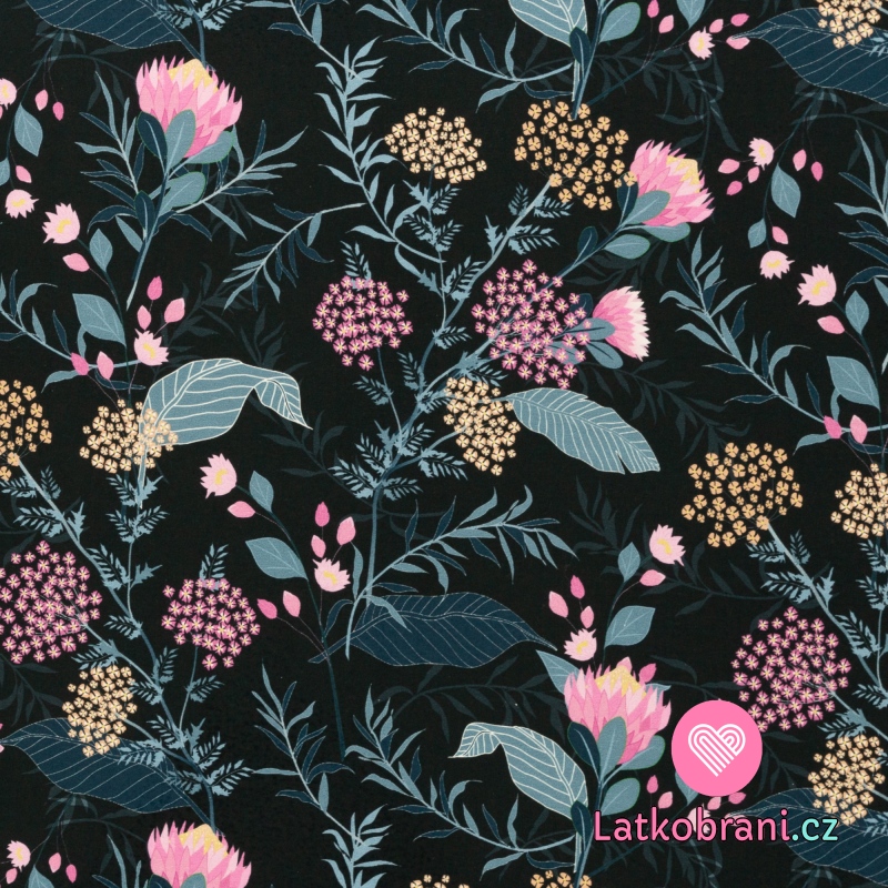 Úplet potisk růžové a žluté bodláky a bolševníky na černé