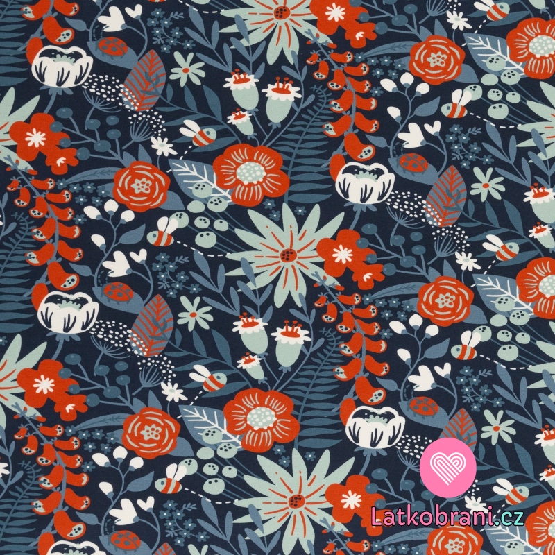 Úplet potisk květinový ráj s včelkou a beruškou v oranžovo - modré