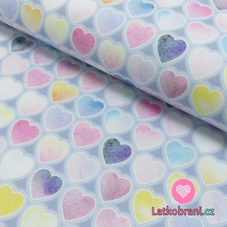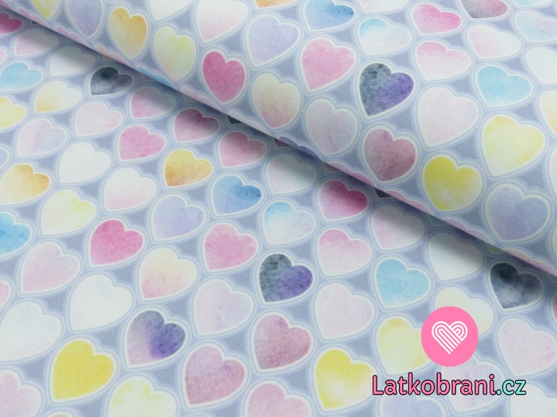 Teplákovina potisk barevná srdíčka v řadách na šedé