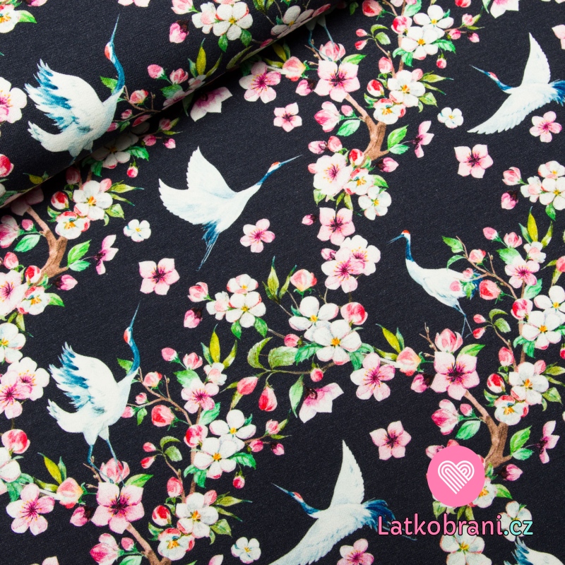 Teplákovina potisk jeřábi mezi květy višní na tmavě modré