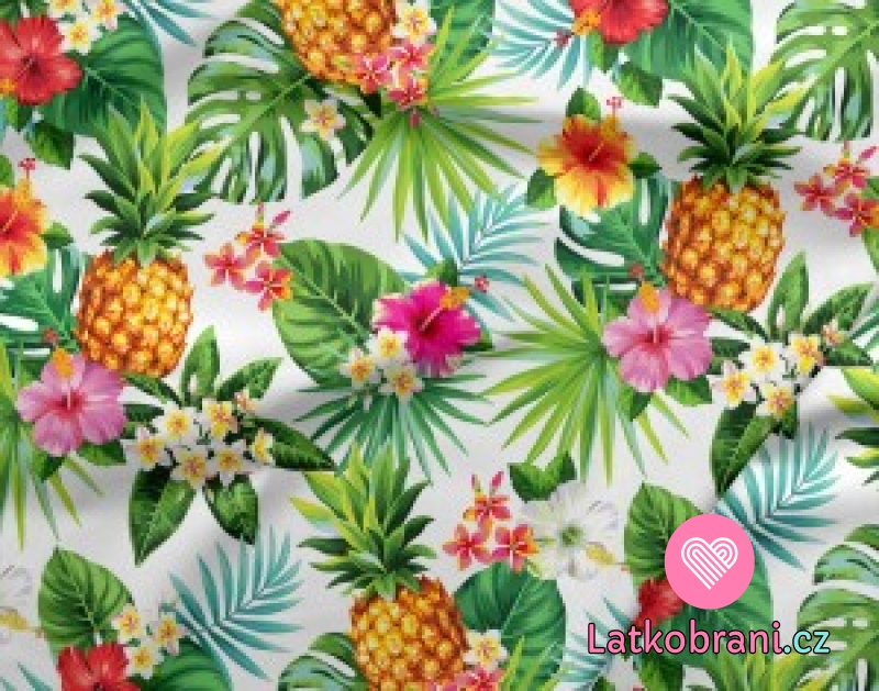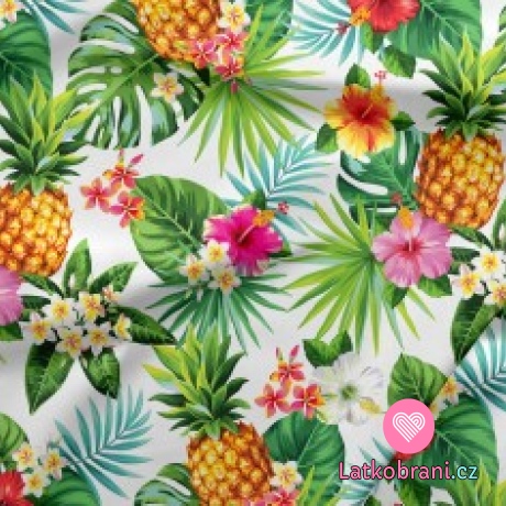 Bavlněné plátno ananasy a květy na bílé