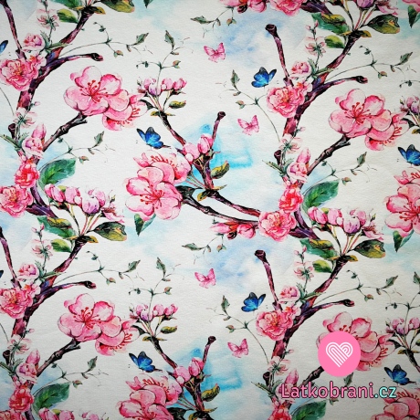Teplákovina potisk rozkvetlá třešeň s motýlky na obloze