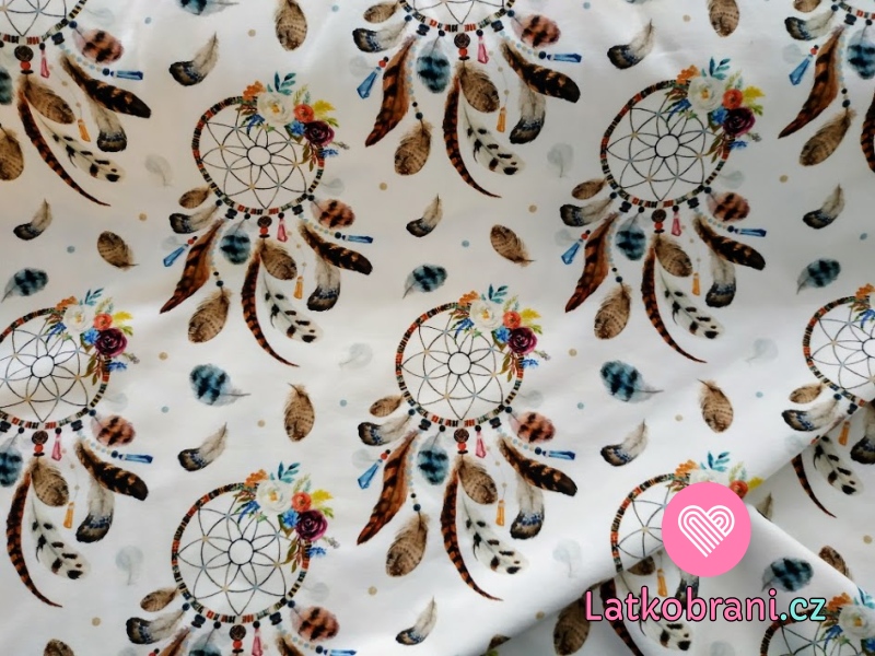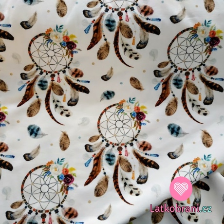 Teplákovina potisk lapače snů mezi květinami a peříčky na smetanové