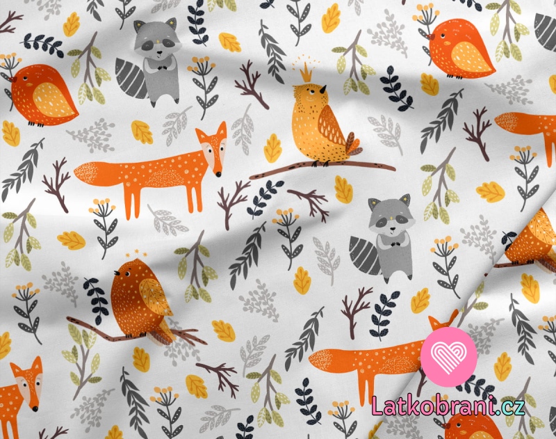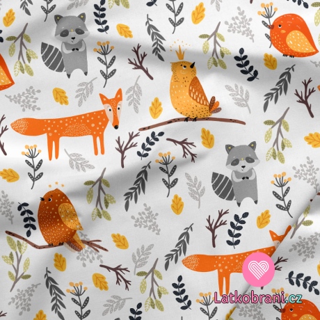 Teplákovina potisk zvířátka mezi větvičkami na bílé