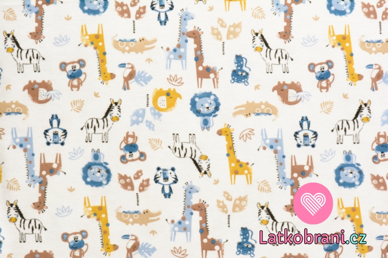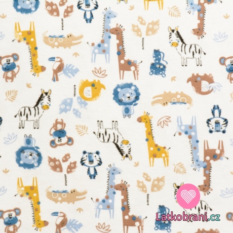 Bavlněný úplet safari zvířátka na zaprášené bílé