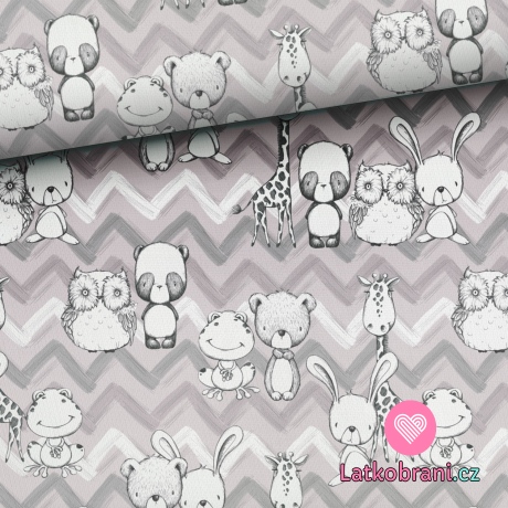 Teplákovina potisk zvířátka na šedo - bílém chevronu