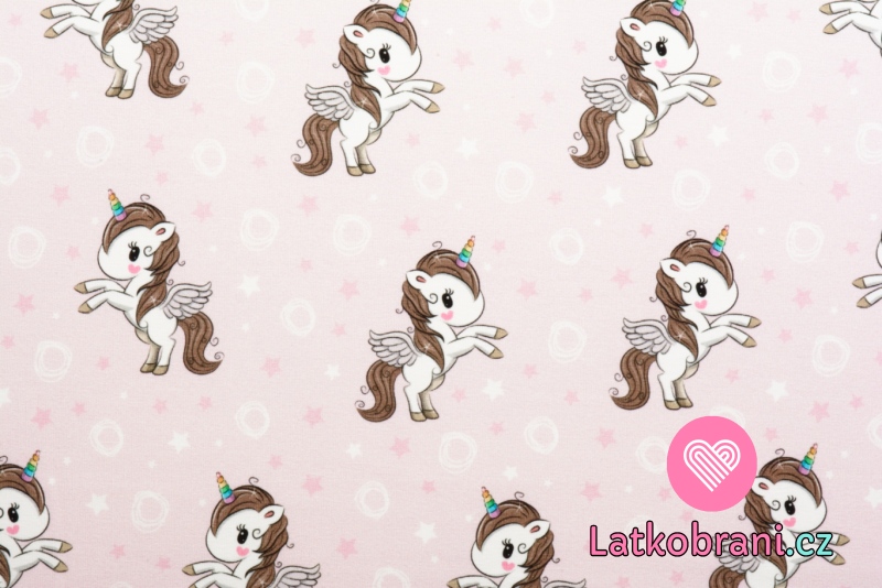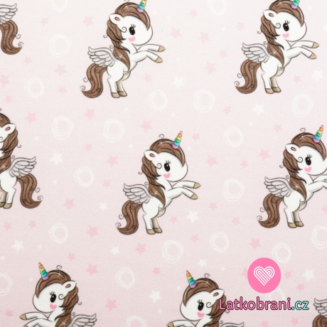 Teplákovina potisk bílí jednorožci mezi kroužky na zaprášené růžové