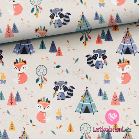 Úplet potisk liška indiánka a mýval indián táboří v týpí na béžové