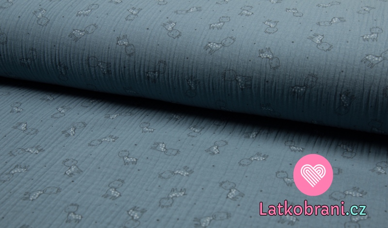 Dvojitá gázovina/ mušelín potisk žirafka na zaprášené tmavší modré