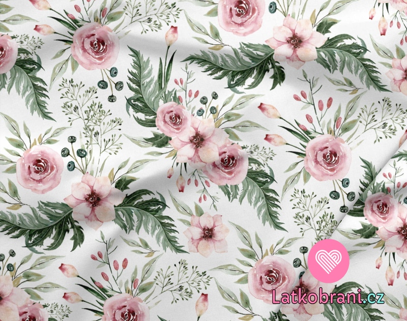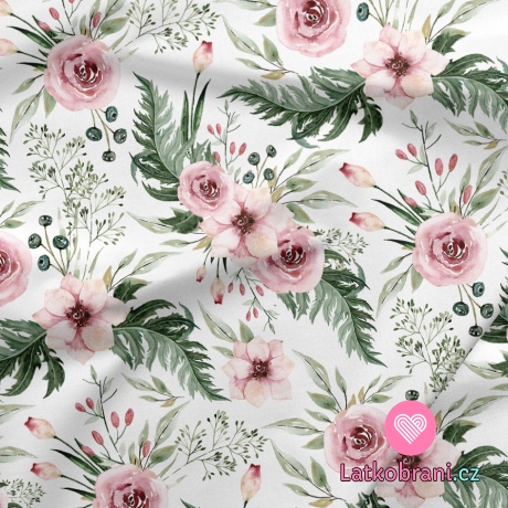 Bavlněné plátno šípková růže s listy na bílé