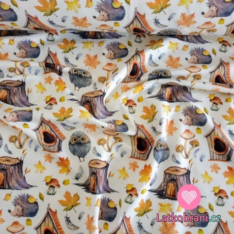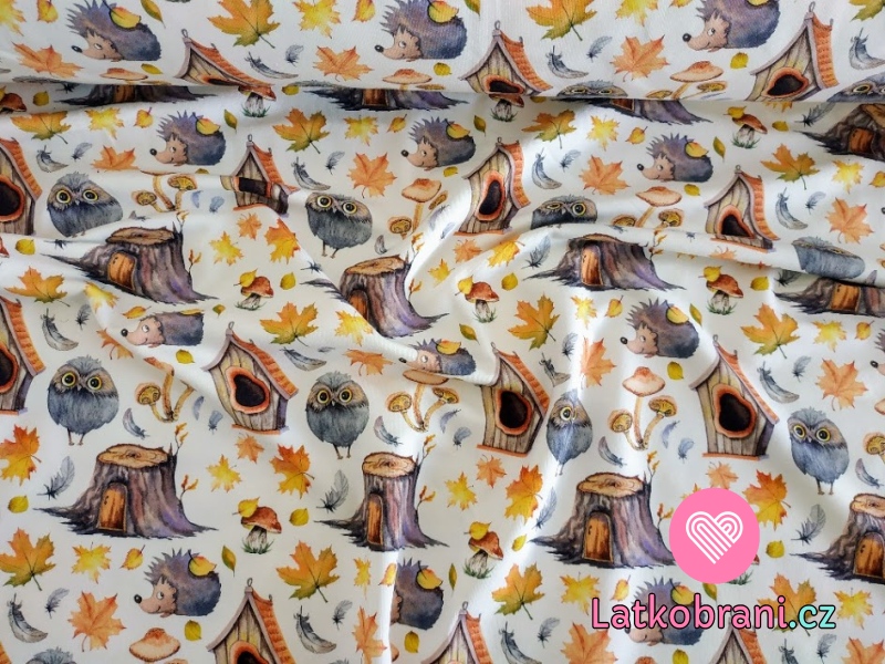 Teplákovina potisk sovička, ježeček mezi pařezy a podzimní listí