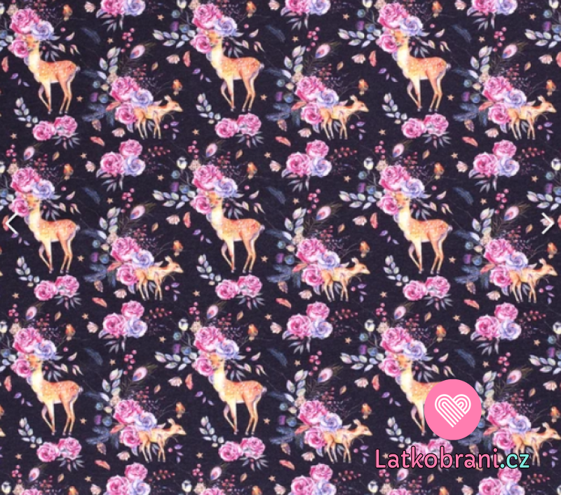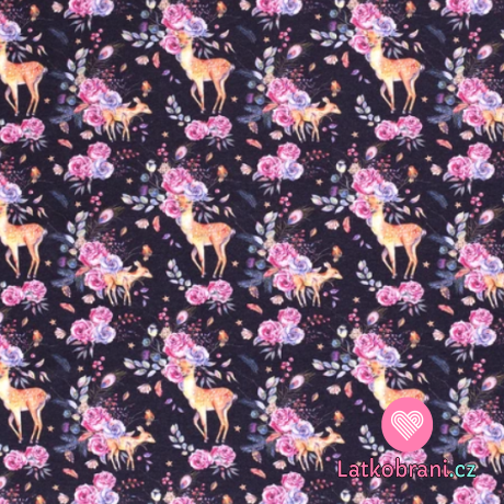 Teplákovina počesaná potisk srnka a koloušek v květinách na námořnicky modré