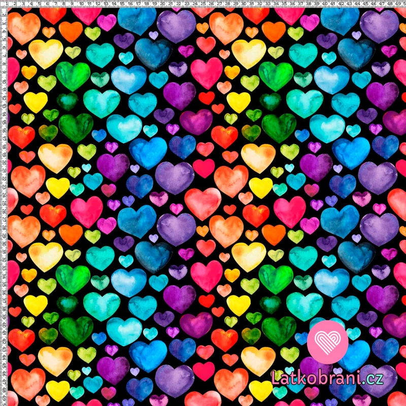 Teplákovina potisk barevná srdíčka na černé