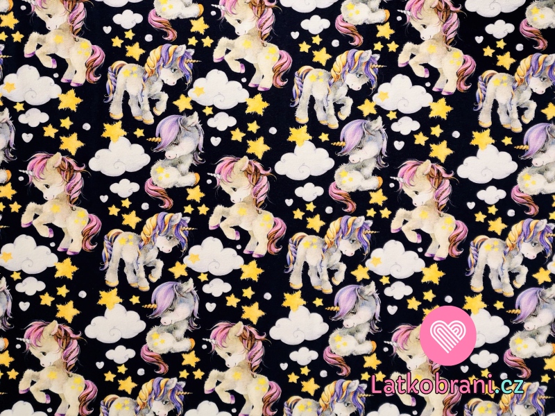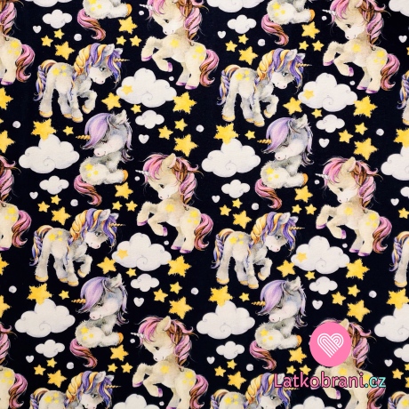 Teplákovina potisk jednorožci mezi obláčky a hvězdičkami na temně modré
