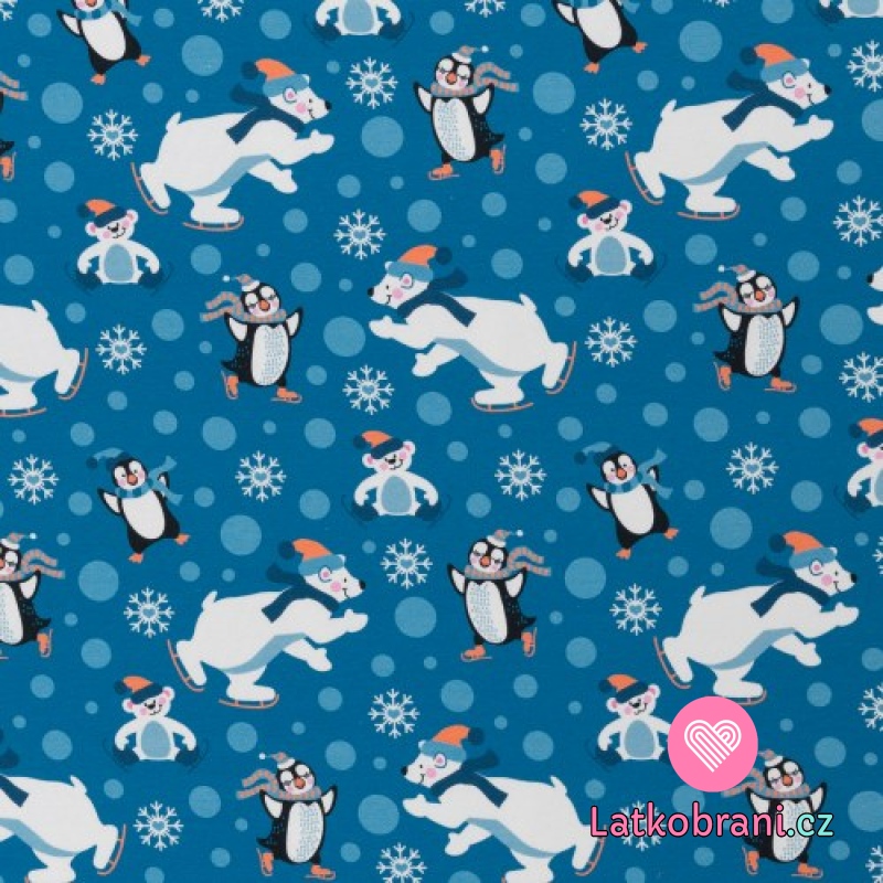 Teplákovina počesaná potisk lední medvěd a tučňáci na bruslích na modré