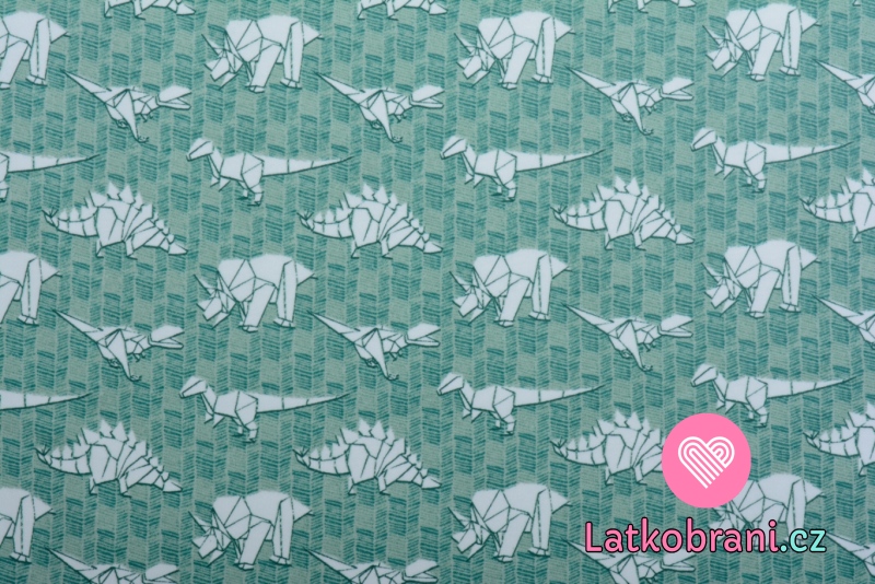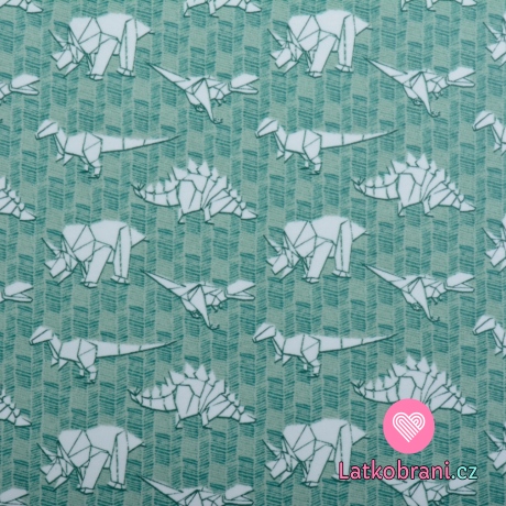 Teplákovina počesaná potisk dinosauří origami na zaprášené zelené, BIO
