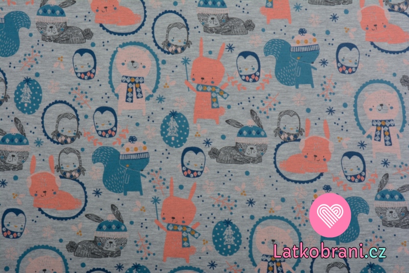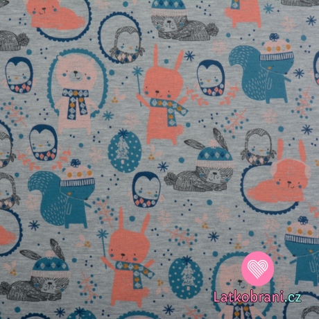 Teplákovina potisk zvířátka v zimě na šedém melé