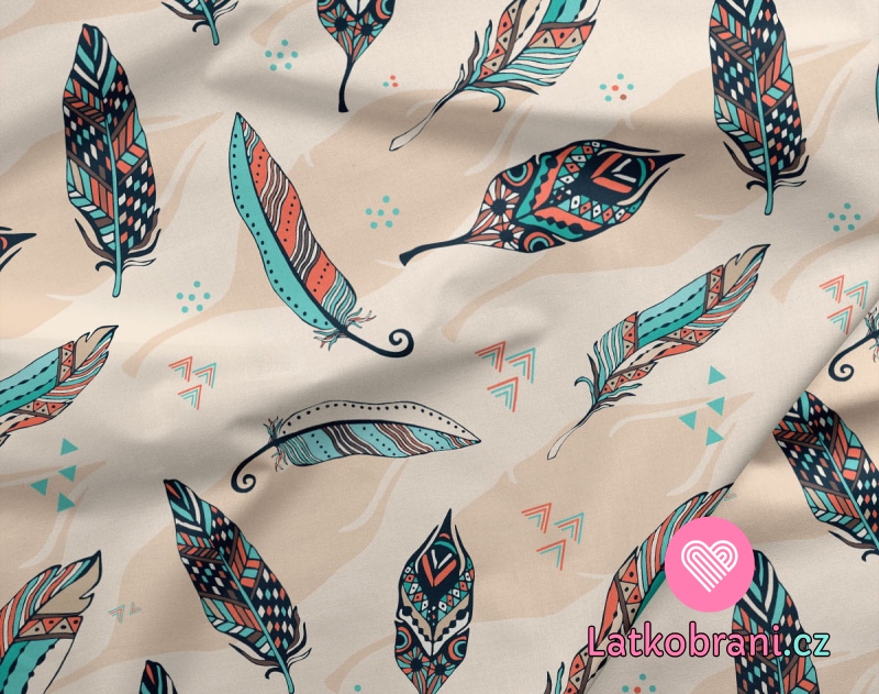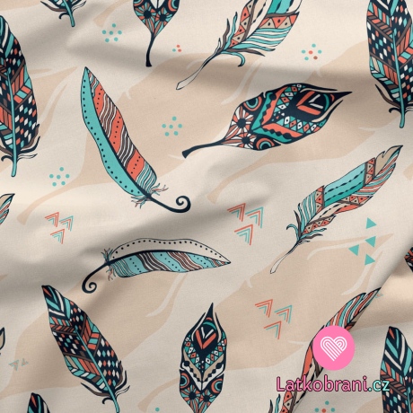 Softshell potisk oranžovo - tyrkysová peříčka na krémové