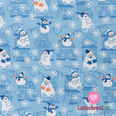 Teplákovina počesaná potisk sněhuláci před domky na modré