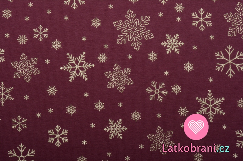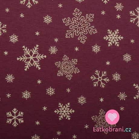 Teplákovina potisk třpytivé sněhové vločky na bordové