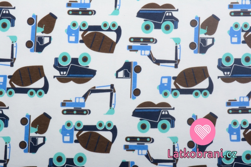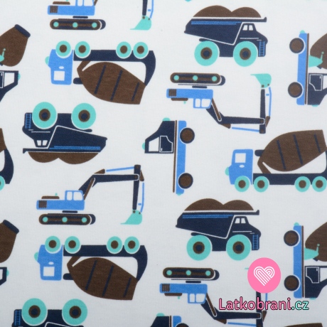 Oboulícní bavlněný úplet stavební auta na bílé