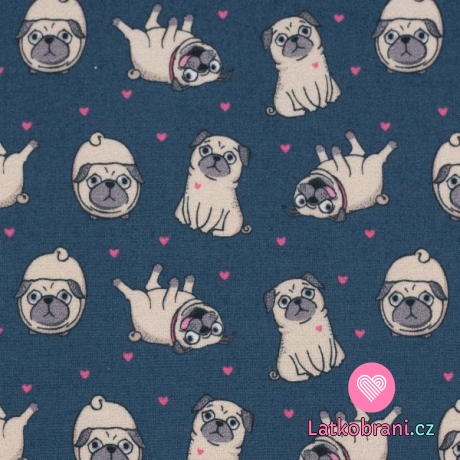 Bavlněné plátno mopsík na tmavě modrém podkladu