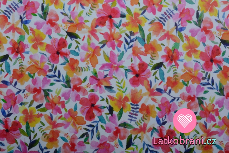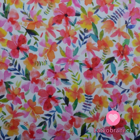 Teplákovina potisk malované květy na bílé