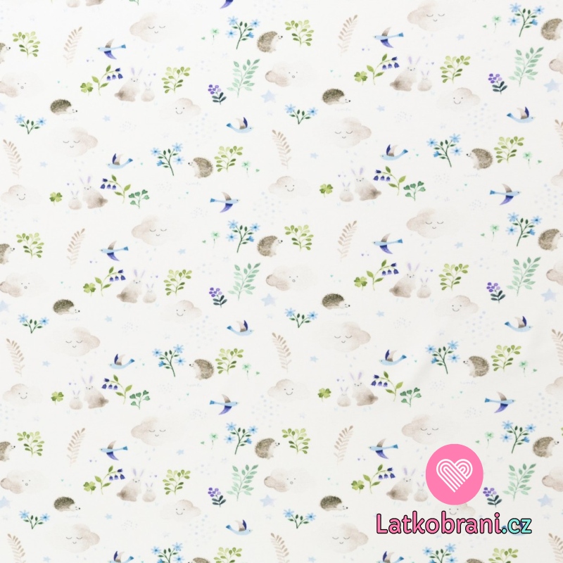 Úplet potisk lesní zvířátka mezi modrým kvítím na bílé