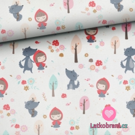Bavlněné plátno Červená Karkulka a vlk na bílé