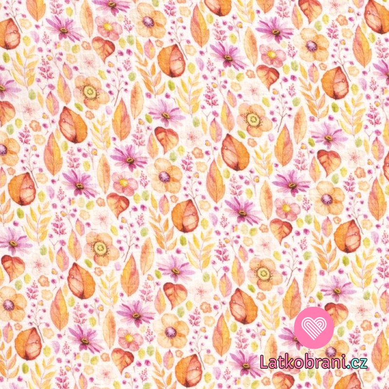 Dvojitá gázovina / mušelín květy mezi listy na bílé