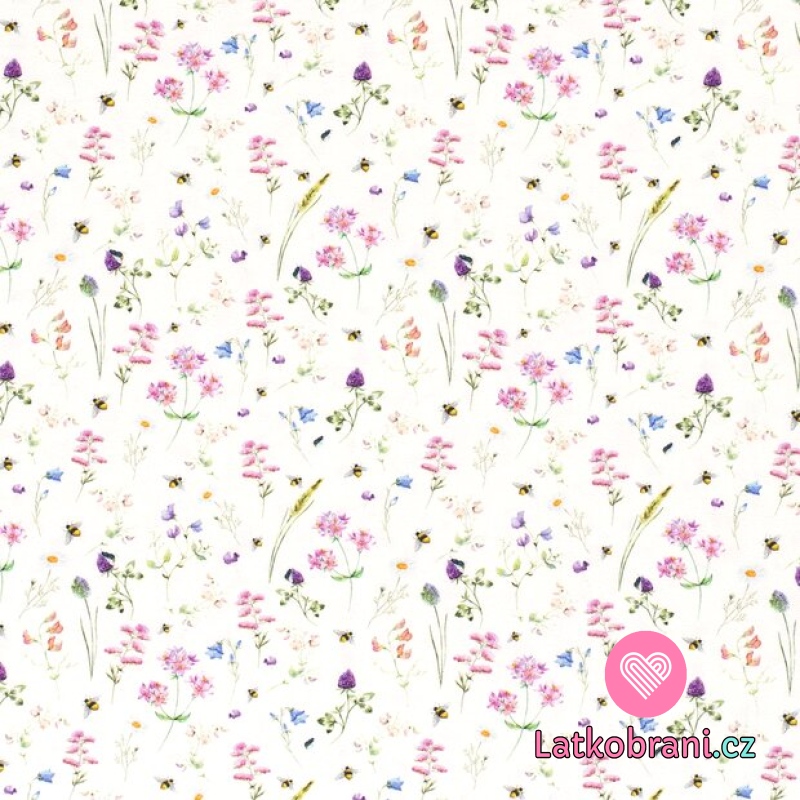 Úplet potisk luční kvítí s poletující včelkou na bílé