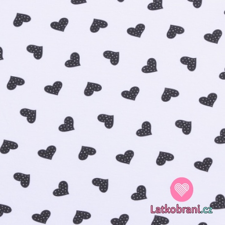 Bavlněný úplet černá puntíkatá srdíčka na bílé
