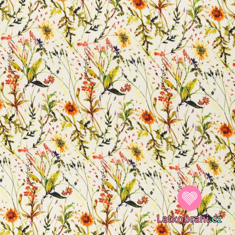 Viskóza potisk luční kvítí na smetanové, hedvábný efekt