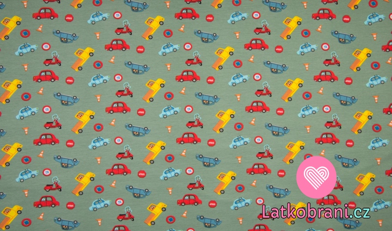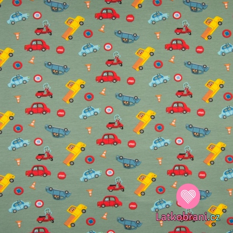 Úplet potisk silniční vozidla mezi dopravními značkami na zaprášené zelené