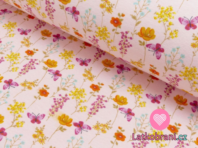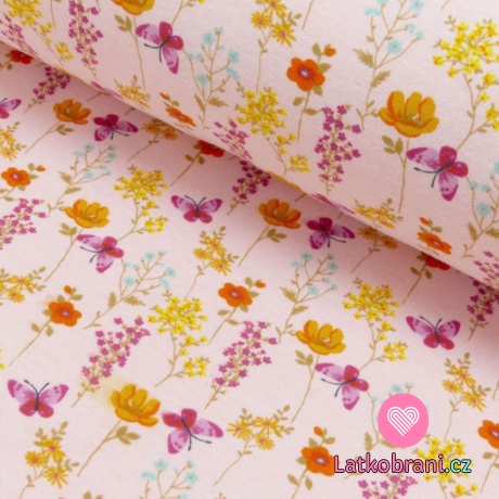 Warmkeeper motýlci mezi kvítky na světlé broskvové