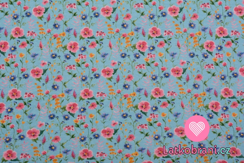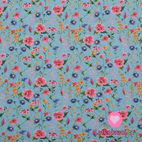 Úplet potisk luční kvítí na nebesky modré, BIO